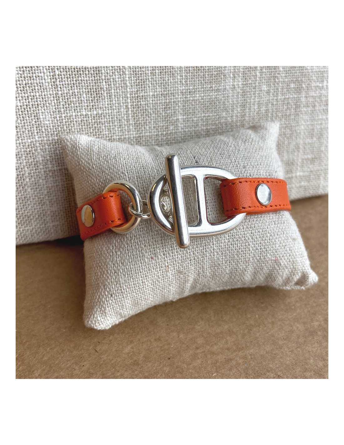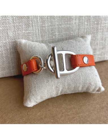 Bracelet monté sur un cordon en cuir (origine Europe).Maille marine et barre T en plaqué argent. Plusieurs couleurs disponibles. Vendu à l'unité.