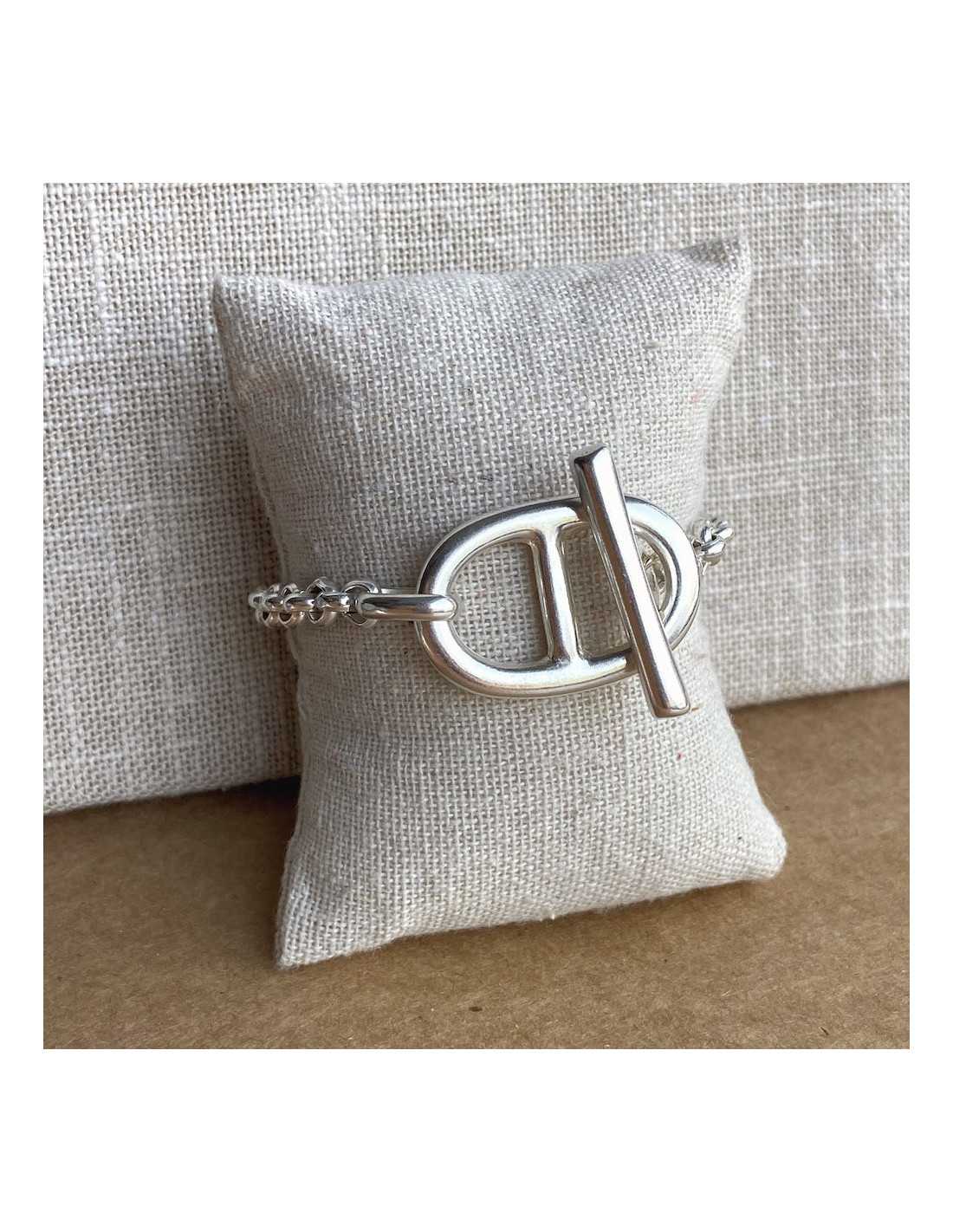 Bracelet avec fermoir toggle et pampilles personnalisables, étoile relief, étrier ou pastille ronde. Maxi: chaîne jaseron 8mm (3 microns) / toggle 24mm Composition : plaqué argent 10 microns Plusieurs tailles disponibles.