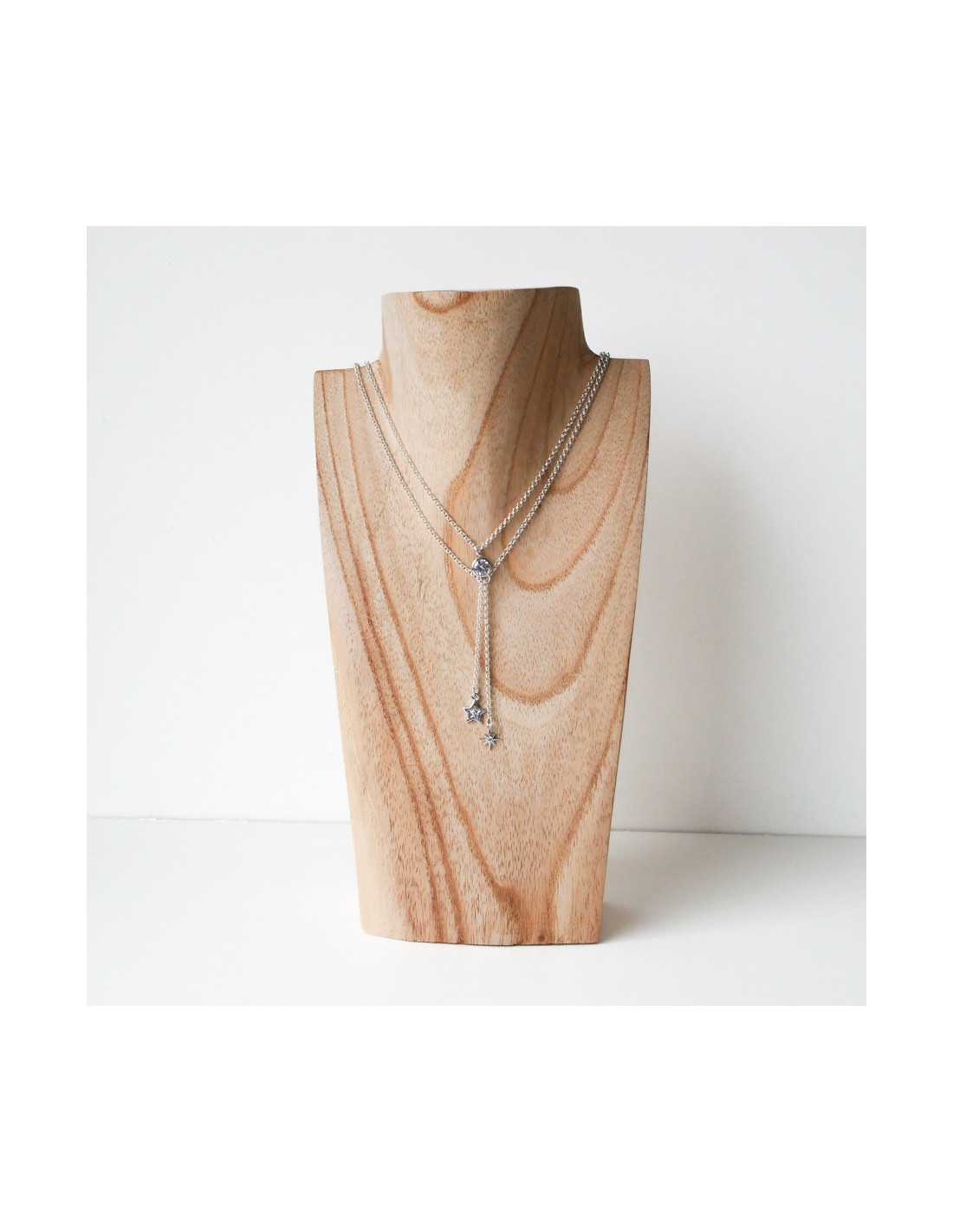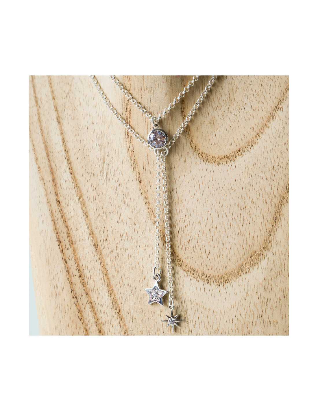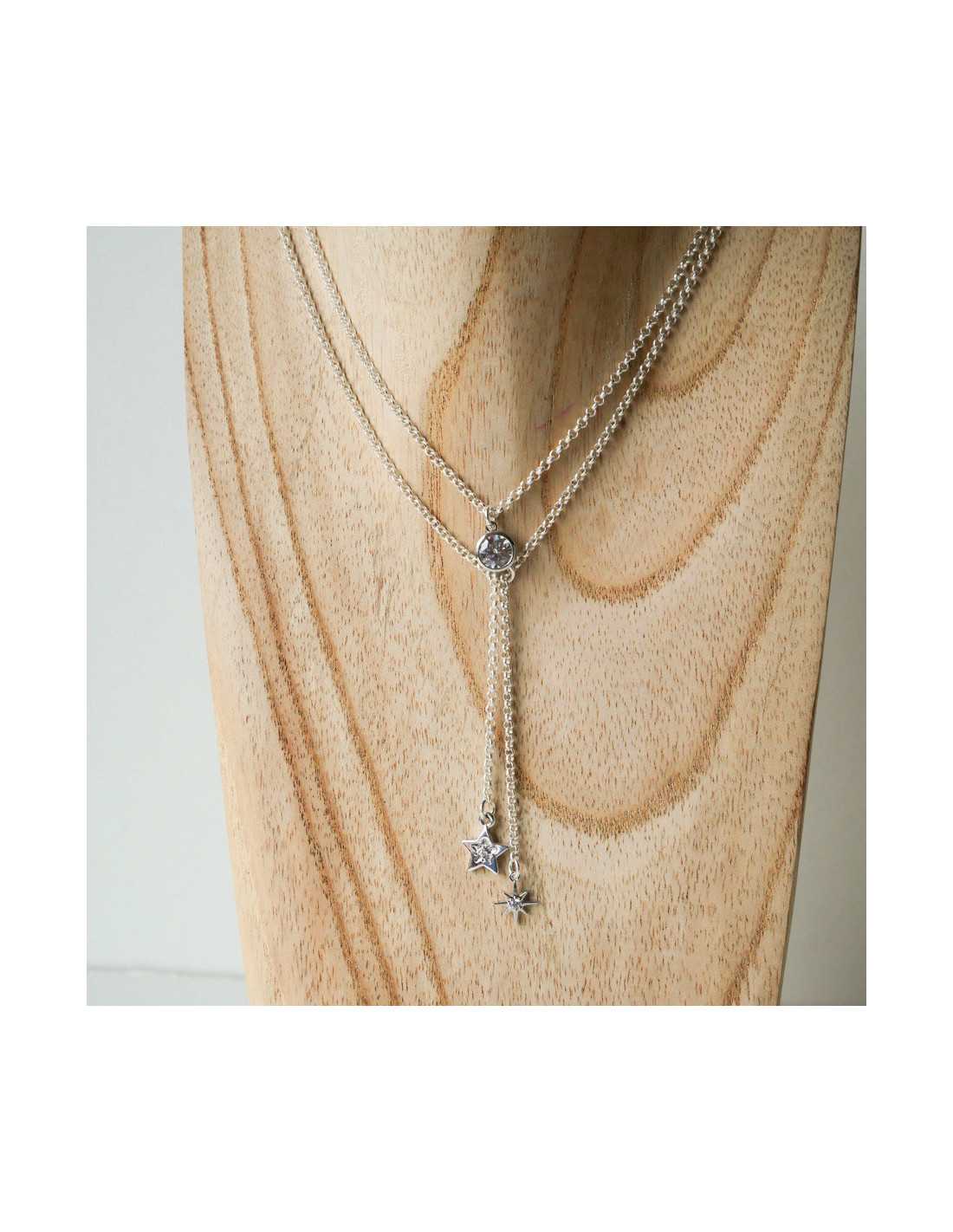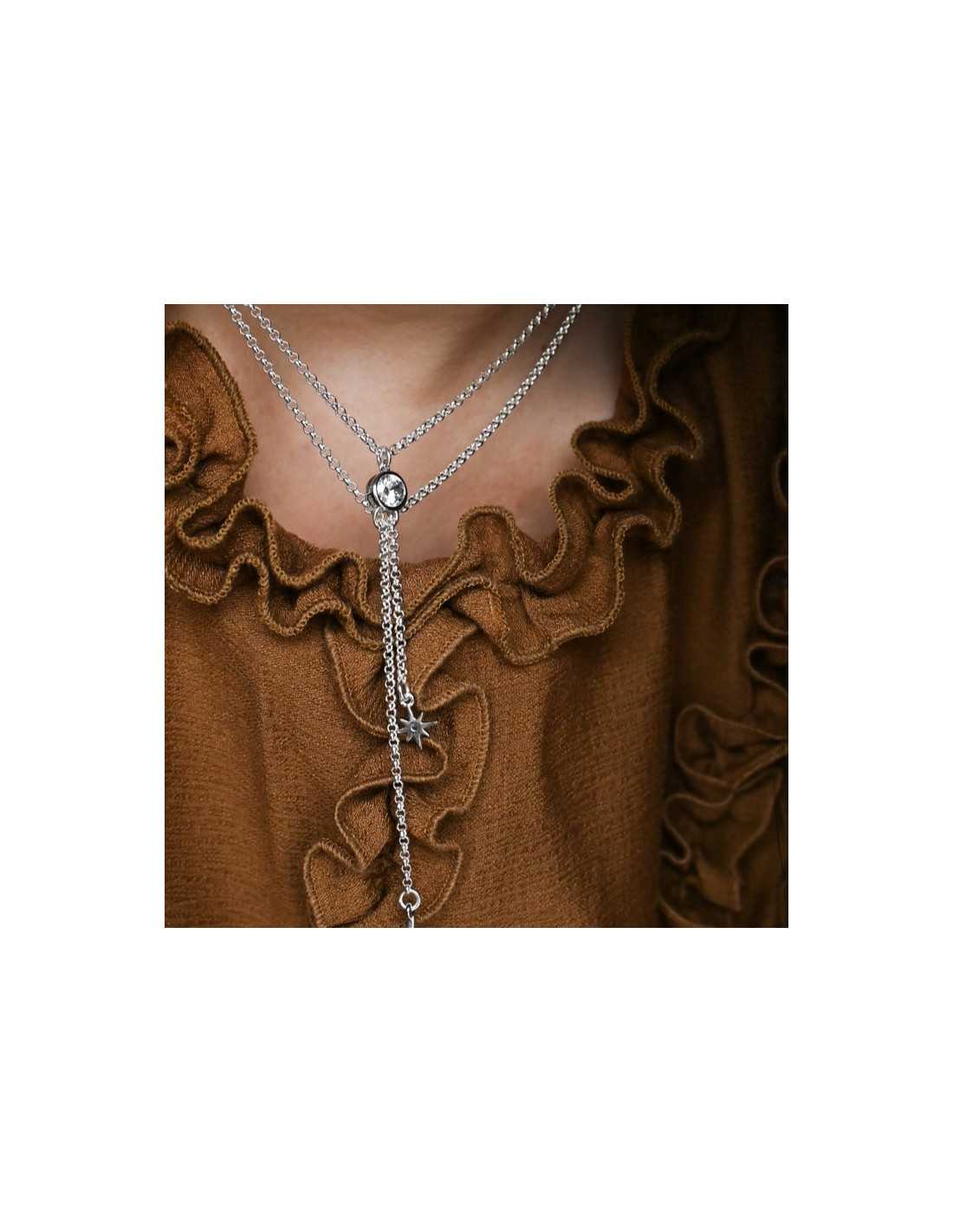 Le collier Marilyn est composé d’une double fine chaîne jaseron. Un pendentif en strass rond habille la première chaîne. Les deux brins de la deuxième chaîne, coulissante, sont quant à eux terminés par une étoile ornée d'un strass et d'une fine et délicate étoile polaire, aussi ornée d'un strass.
