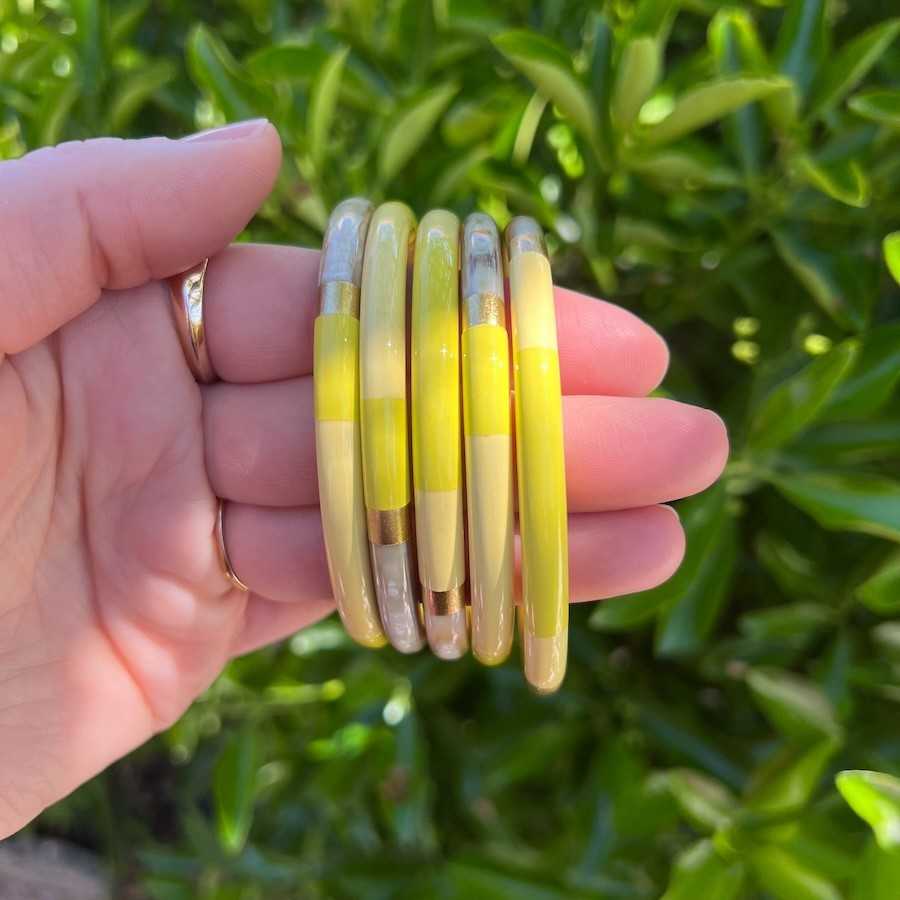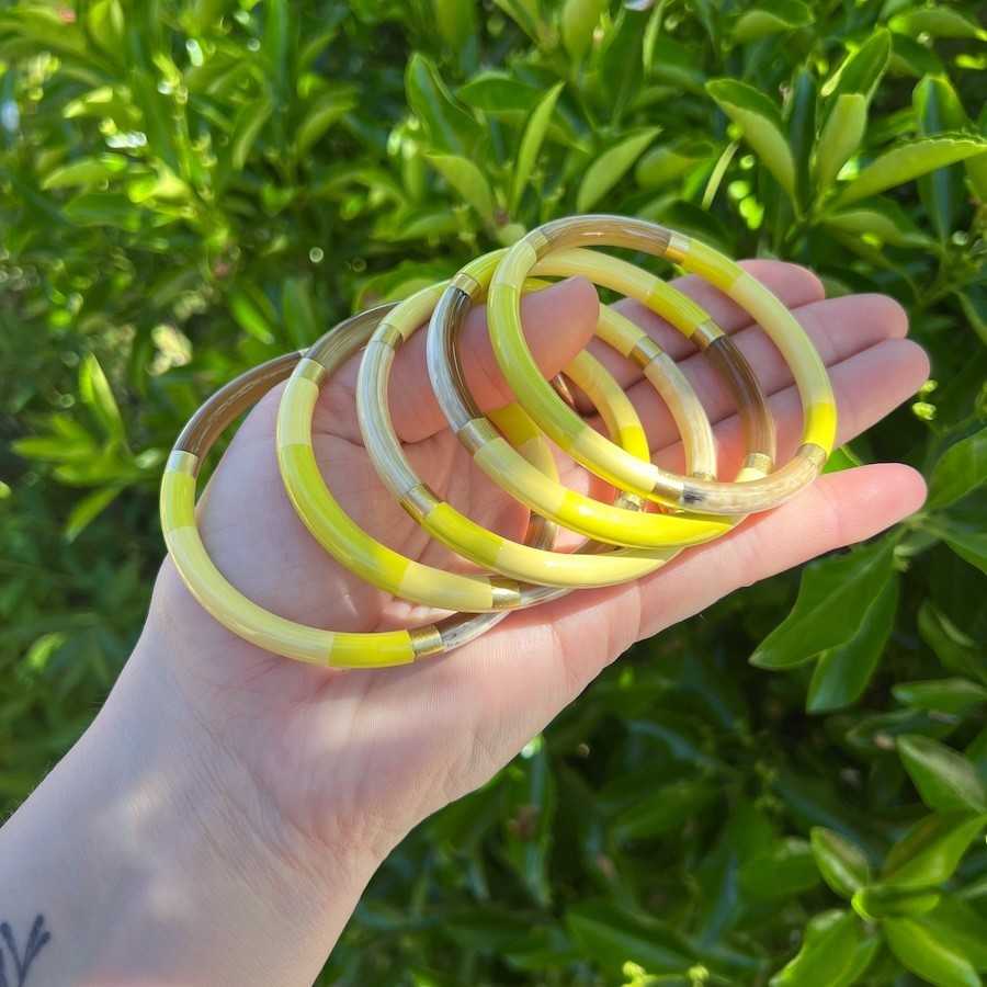 Jonc en corne, 3 couleurs de laque , naturelle Composition : corne de buffle naturelle Dimensions : Section 6 mm environ T1 : 60 - 65 mm diamètre intérieur T2 : 66 - 71 mm diamètre intérieur Ce produit étant naturel, les teintes peuvent variées d'une pièce à l'autre ainsi que les dimensions des pièces Vendu à l'unité. ANCIENNE REF CORN151