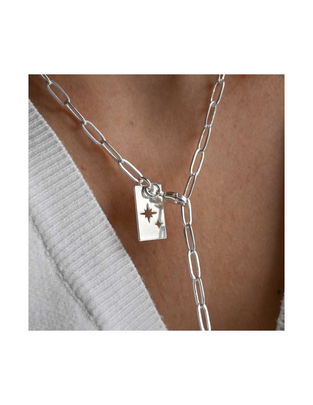 Monté sur une chaîne trombone, le fermoir mousqueton est placé sur le devant du sautoir. Juste à côté de lui se trouve le pendentif carte rectangulaire, percé de deux étoiles polaires. Deux autres pendentifs se situent à l'extrémité du bijou, terminant sa ligne gracieuse par des petites étoiles. L'une d'elle est ornée d'un strass, nouveauté lumineuse d'Hobbyjoux.